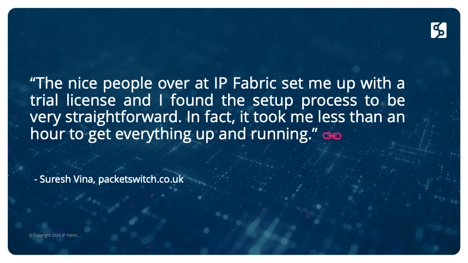 “IP Fabric pulls the data that you need from every device in your network for quick analysis; it doesn't stop at letting you analyze the data easily, but allows you to plug it into your processes and workflow. That can be applied to anything - automation, troubleshooting, hardware refresh planning - and it gives you that contextualized insight into your network, both from a high level and down to the details.