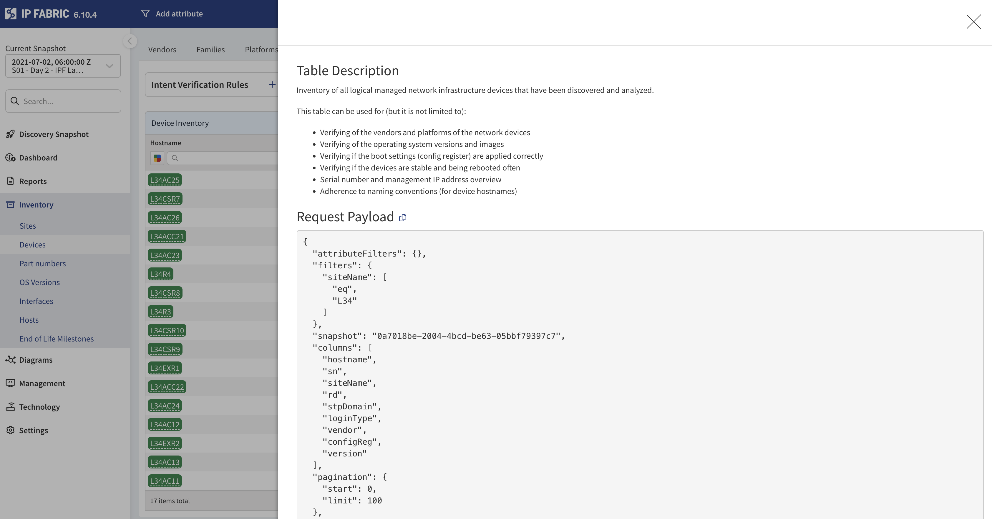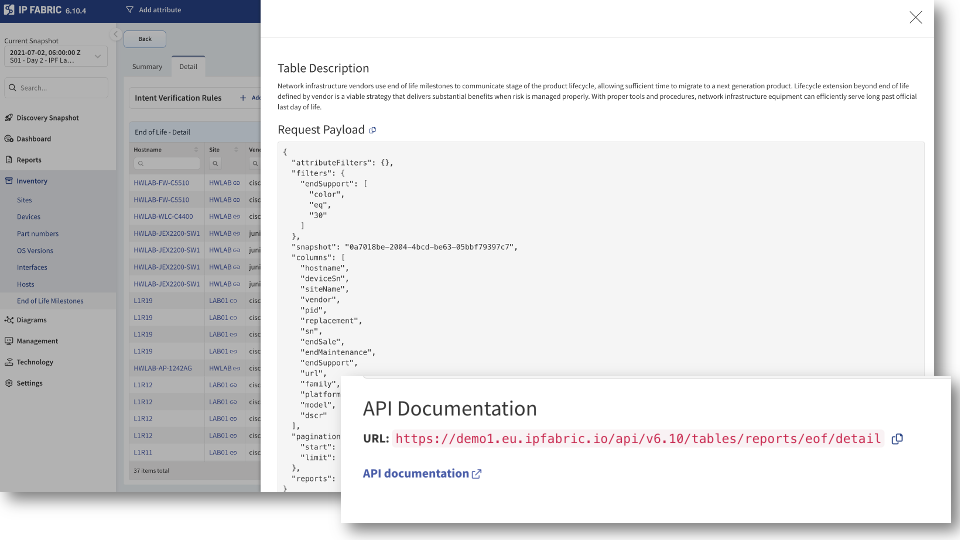 Everything available in IP Fabric, is available via the API. You can easily access the table description to use for API calls from different platforms or technologies.