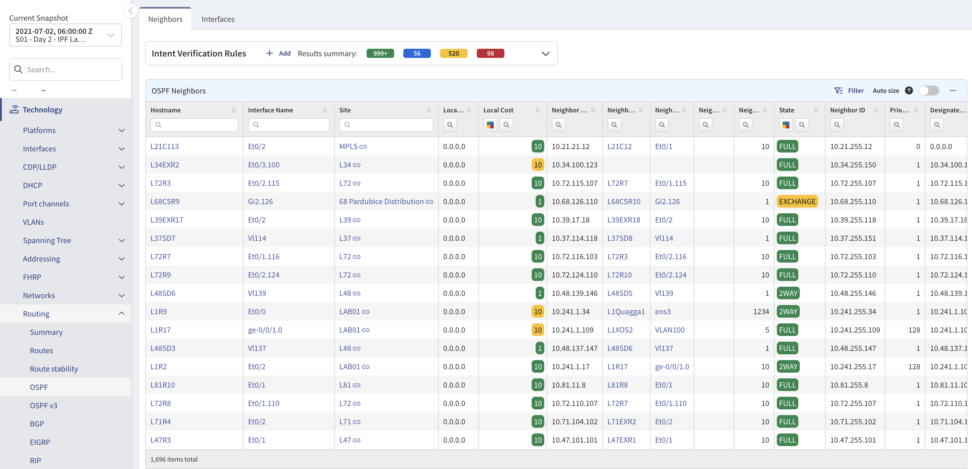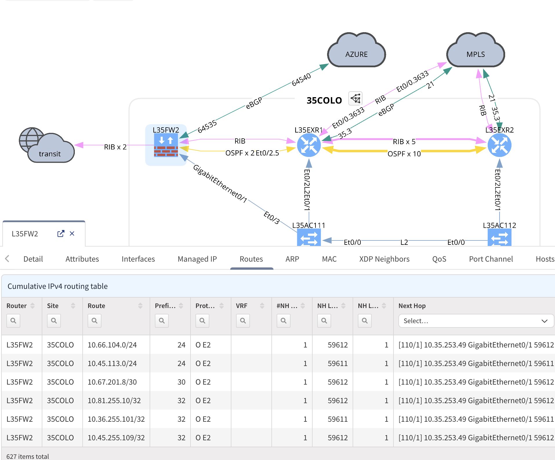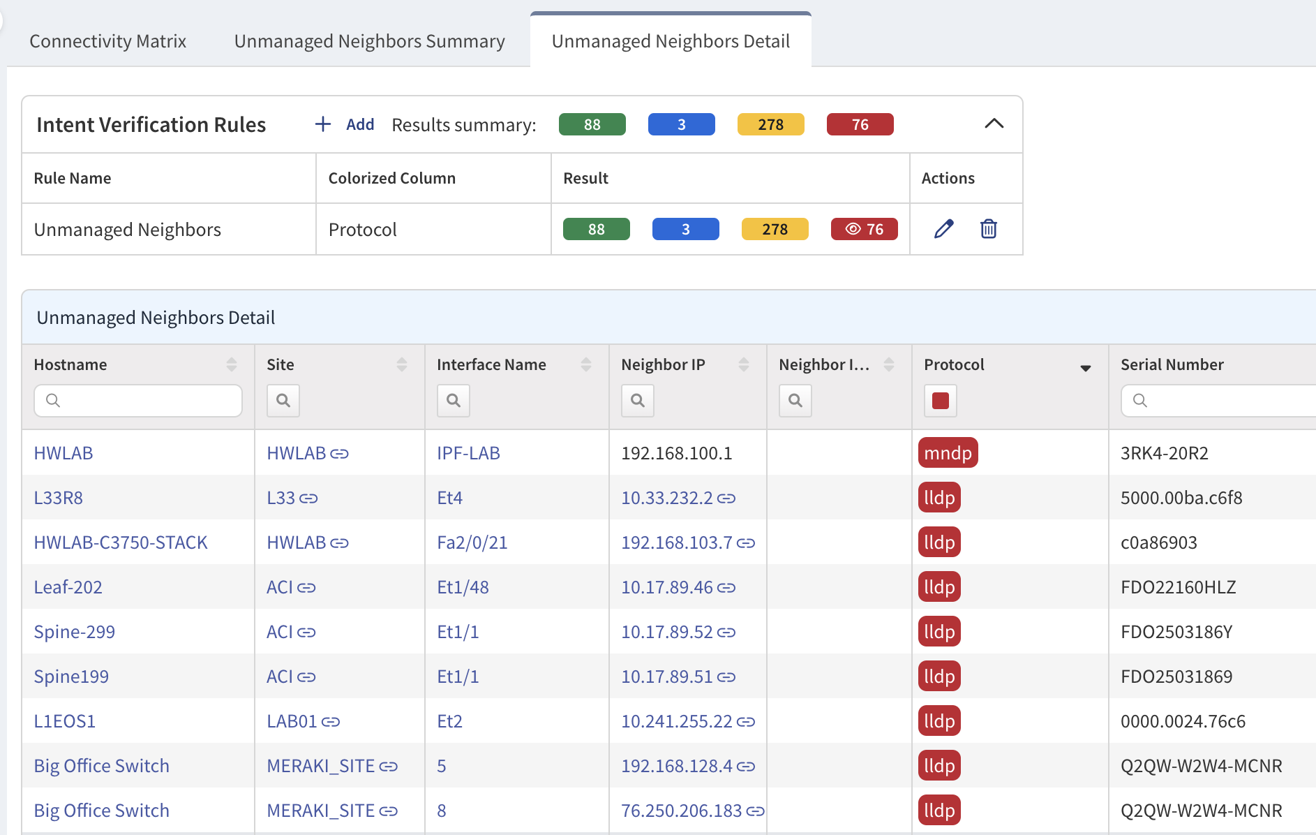 We’ve already applied an intent verification rule to this table, sorting unmanaged neighbors with BGP protocols in green, unmanaged neighbors with interior gateway protocols in yellow, and LLDP/CDP, direct but unmanaged neighbors, in red.
