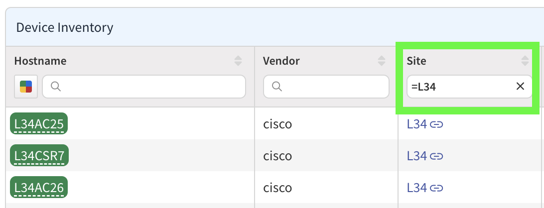 For advanced searches, you can apply filters using logical conditions like “host name contains” or “site =.”