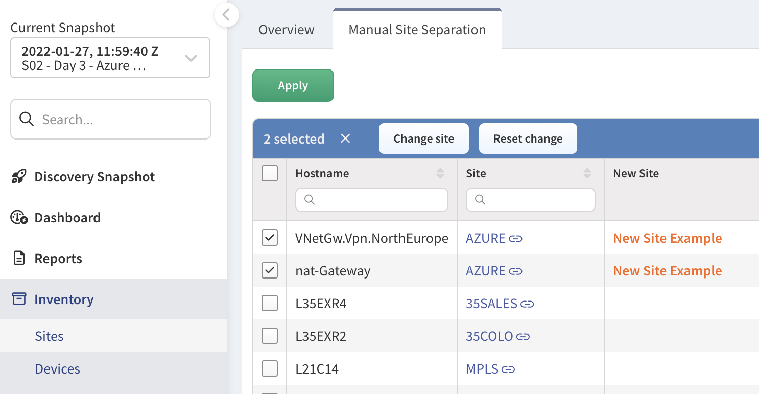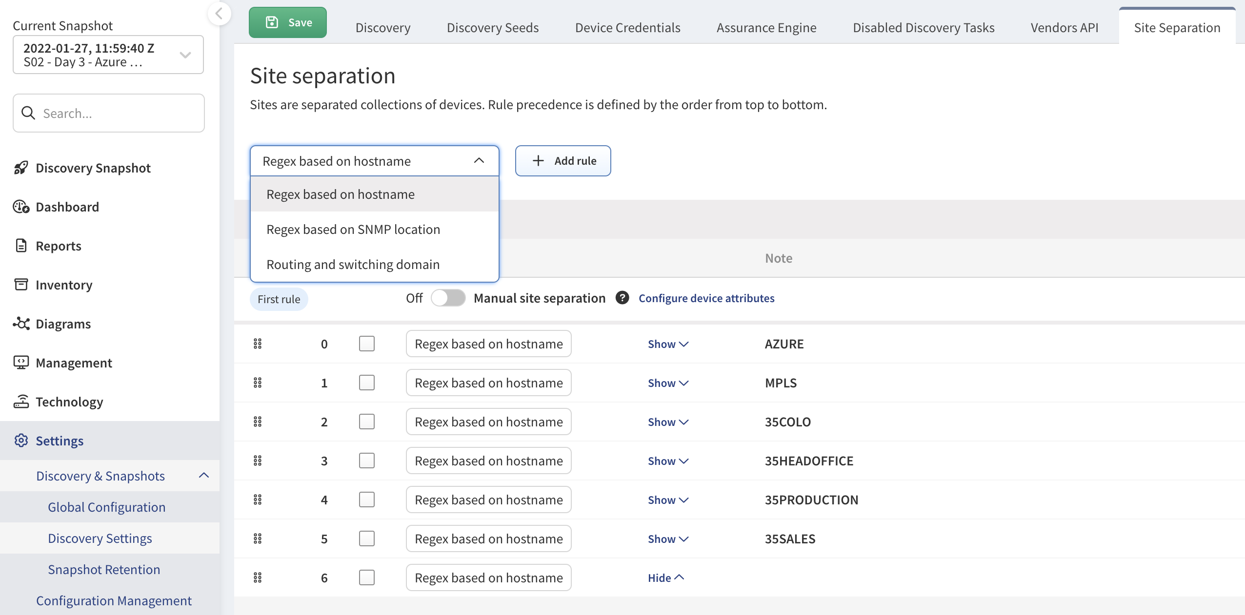 While manual separation is recommended for this free trial, IP Fabric also offers automatic site separation using Regular Expressions (Regex). This method is ideal for larger networks with well-structured device naming conventions, or you can use parameters like SNMP location or routing and switching domain.