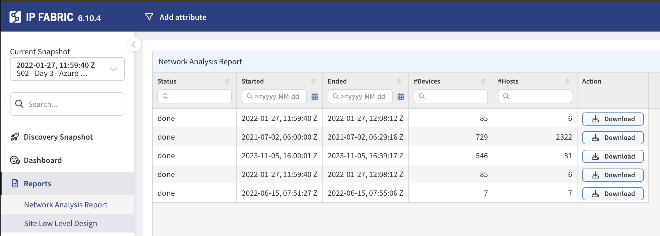 Up to 5 snapshots - each which contains a model of your network at a specific point in time - are loaded at a time. See them in your Discovery Snapshot tab: