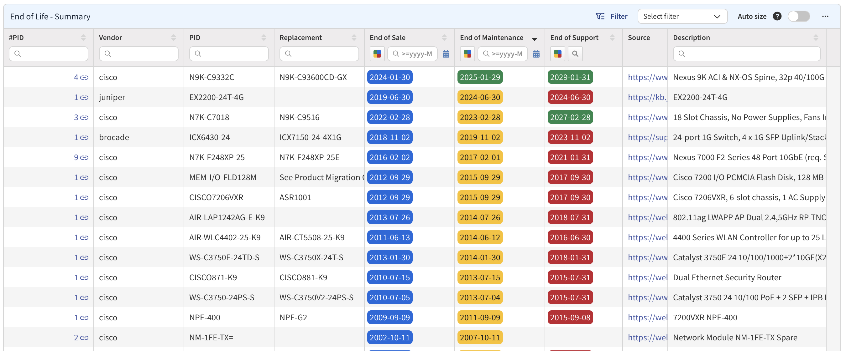 IP Fabric automates device lifecycle management by gathering hardware and software data across the network, eliminating manual cross-checking with vendor portals. This data includes make, model, serial numbers, and vendor-suggested replacements.