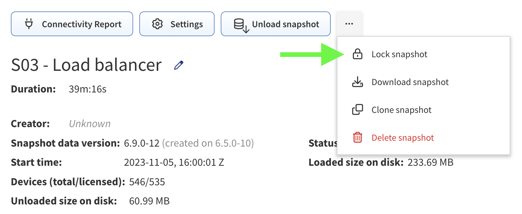 Unloading a snapshot will move network state information from RAM to HDD, creating room for a new one. You can download any snapshot to store externally and re-upload later. You may want to load previous discovery snapshots to do a historical comparison of your network.