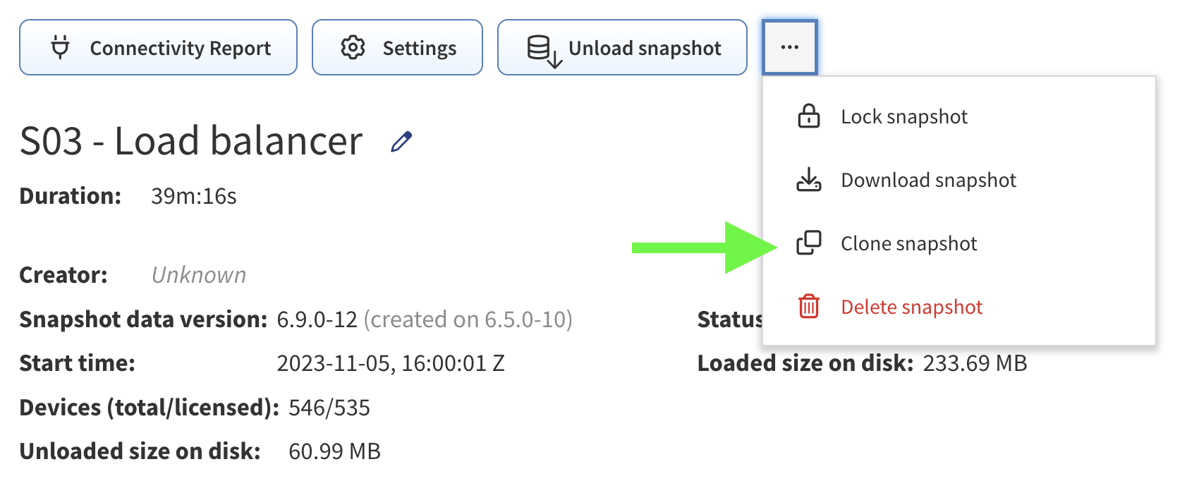 Click Clone Snapshot to create an exact copy of a discovered point in time network model: