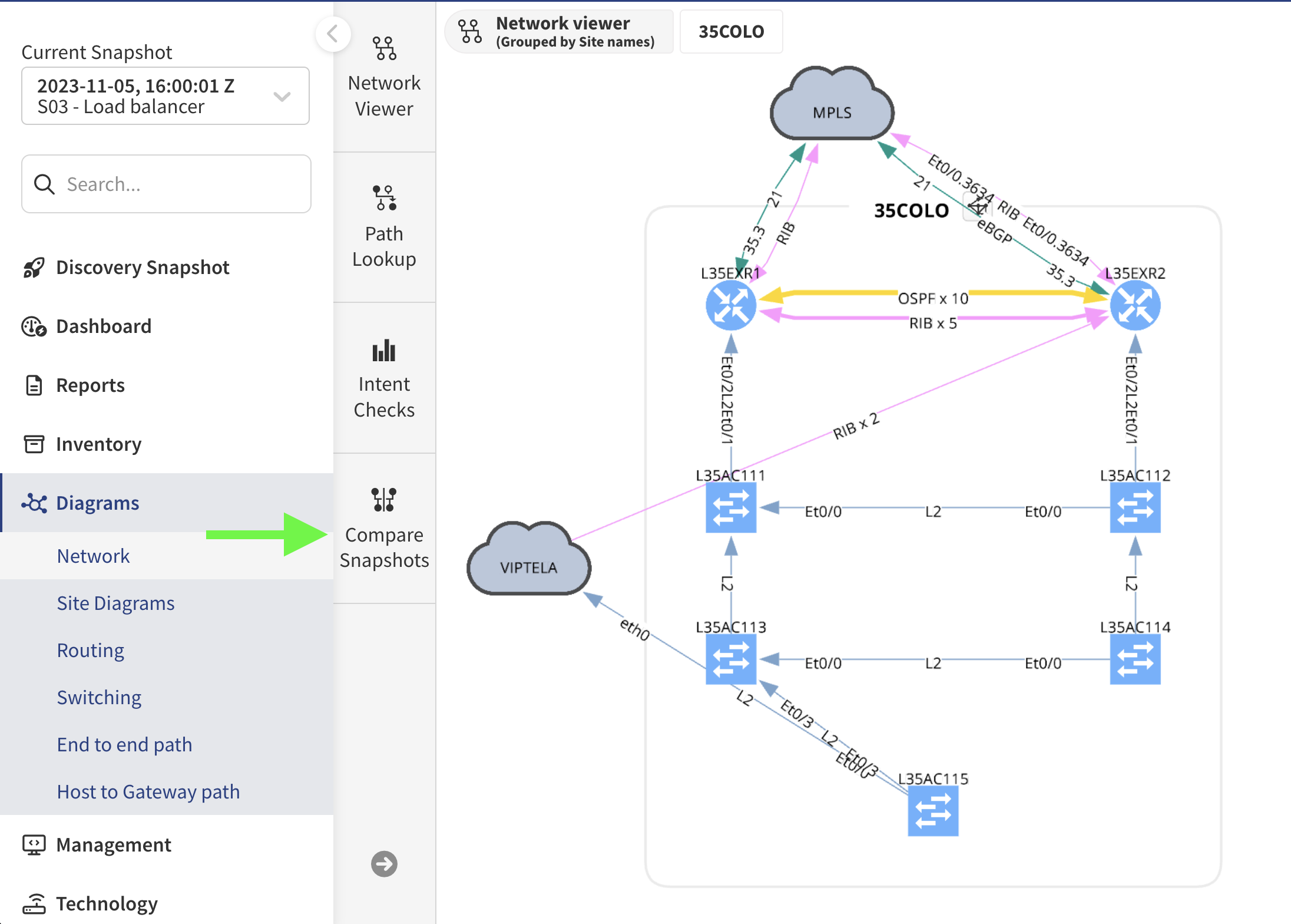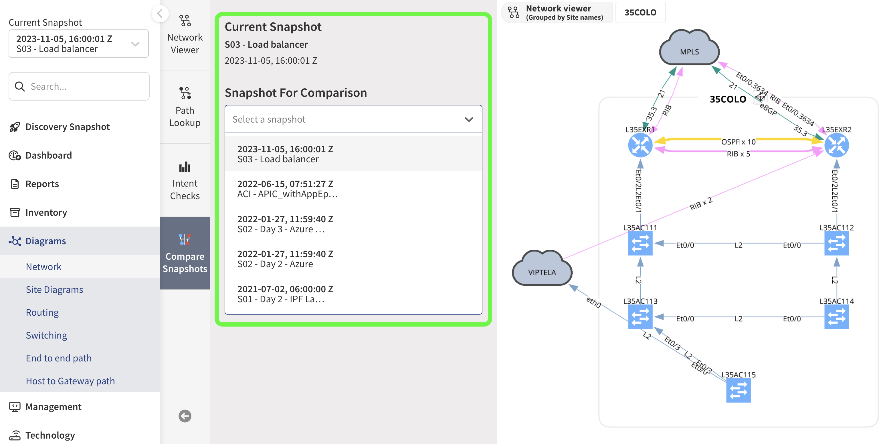 A massive benefit of snapshots is the ability to quickly compare your network to a previous state and answer “what’s changed” in seconds. From the Diagrams view, simply click Compare Snapshots: