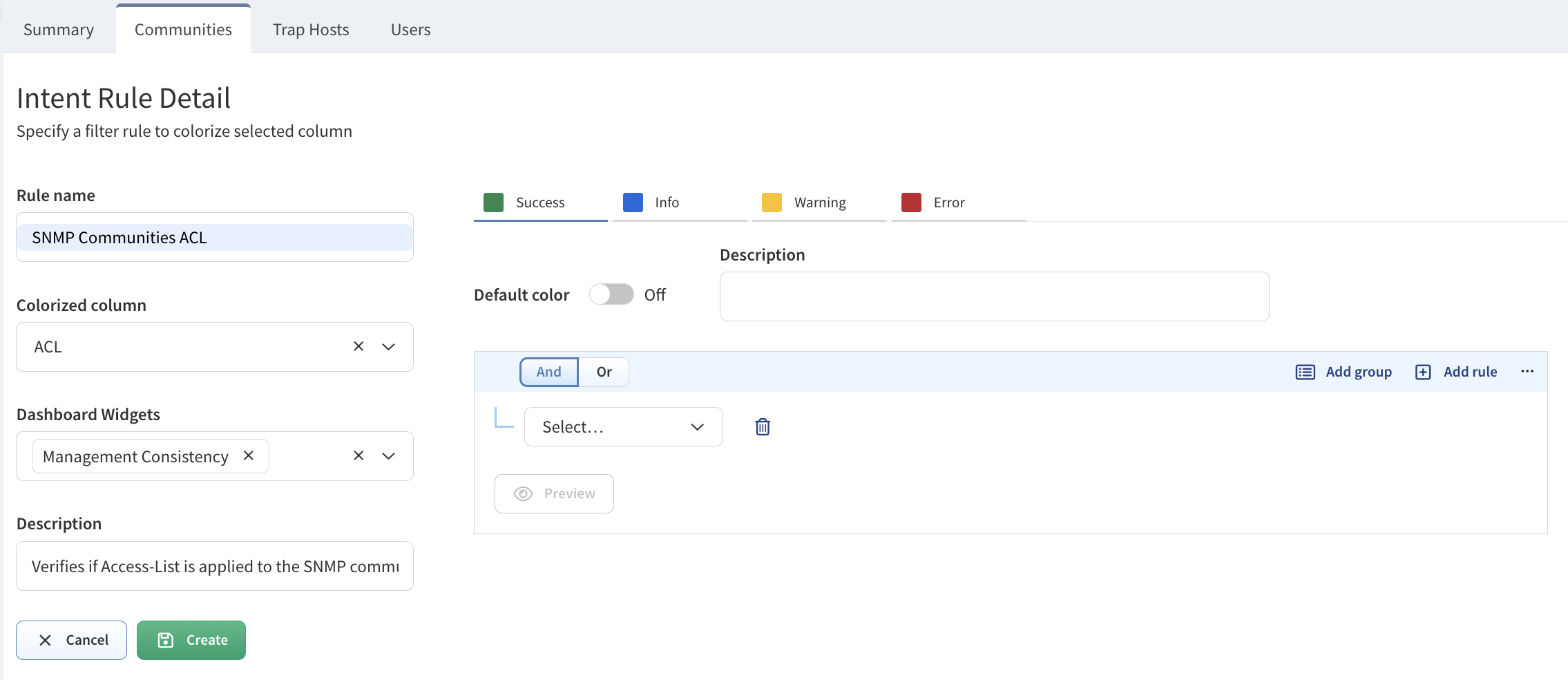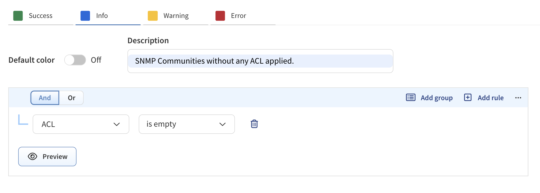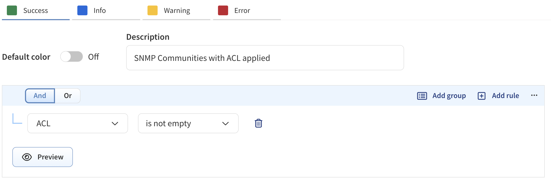 Define default and conditional filtering rules. There is an option for a configurable default color. For this example, we just want SNMP Communities that do have ACL lists applied to show up green, and those without to show up blue or this example, so we can simply focus on Success (green) and Info (blue), with no default option needed.