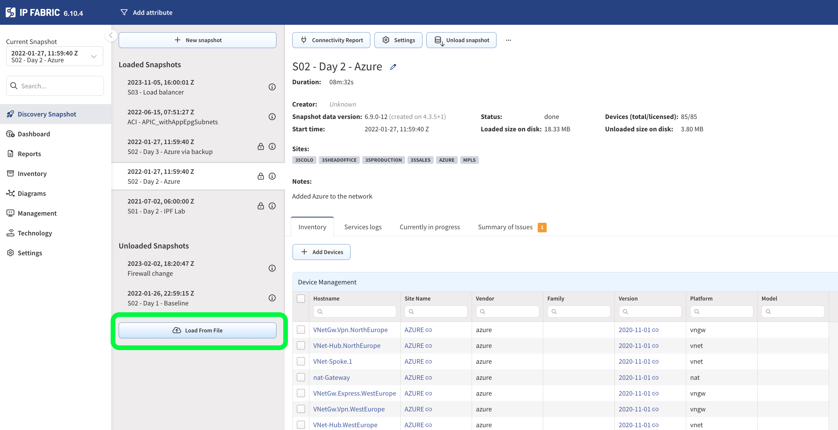 Use these demo snapshots if you don't have a lab or network environment you wish to use for this free trial. Click to download and upload in the IP Fabric Discovery Snapshot as shown below. They represent day-by-day change in a hybrid cloud environment: